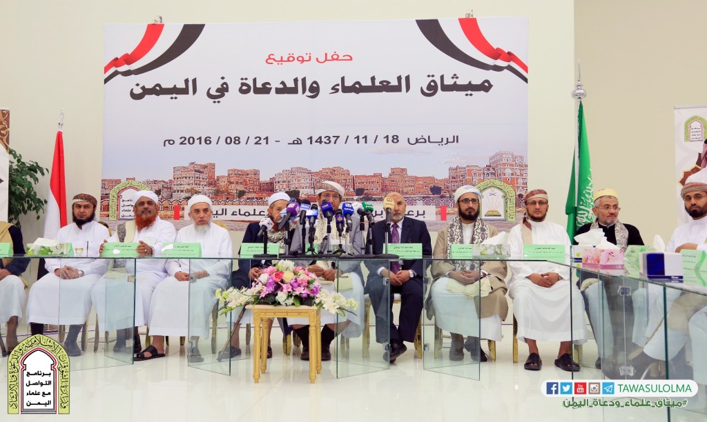 شهدت العاصمة السعودية مساء اليوم الأحد حفل توقيع ميثاق العمل الدعوي بين العلماء والدعاة من جميع المدارس الفقهية والمكونات الدعوية وسط ترحيب شعبي كبير. وبدأ الحفل الذي حضره أكثر من 70 من علماء ودعاة اليمن يمثلون مختلف التيارات الدعوية في مختلف المناطق اليمنية بآيات من الذكر الحكيم، ثم رحب منسق برنامج التواصل مع علماء اليمن الشيخ محمد الوشلي بالحاضرين، وأشار إلى دور برنامج التواصل مع علماء اليمن في إنجاز هذا الميثاق، والجهود الكبيرة التي بذلها خلال أكثر من عام، في مجالات شتى، والميثاق أحدها، وبين أن الميثاق حلقة من حلقات إنجازات البرنامج، وخطوة من الخطوات التي يحققها علماء اليمن، وأنه سيتحول إلى برامج عملية بإذن الله. وألقى مستشار وزير الشؤون الإسلامية والدعوة والإرشاد السعودية الدكتور إبراهيم الزيد كلمة تحدث فيها عن موقف المملكة الداعم للعمل الدعوي في اليمن والذي كان آخره استضافة المملكة لبرنامج التواصل مع علماء اليمن الذين وقعوا ميثاق العمل الدعوي مساء اليوم بمقر الوزارة. وأكد الزيد أن البرنامج مضى على عمره قرابة عام ونصف بعد توجيه سام من خادم الحرمين الشريفين الملك سلمان بن عبدالعزيز بدعم هذا البرنامج وإشراف وزارة الشؤون الإسلامية عليه حتى تم التوقيع على الوثيقة التي تجمع كلمة العلماء في الوقت الذي تمر فيه اليمن بمحنه عصيبة. وأشاد الزيد بالحكومة اليمنية وحرص الرئيس هادي على متابعته واهتمامه بالعلماء. من جهته ألقى الشيخ أبو الحسن السليماني المأربي رئيس لجنة إعداد الميثاق، كلمة تطرق فيها إلى المرحلة التي مرت بها تجربة إعداد الميثاق حتى وصل إلى مرحلته الأخيرة ومن ثم التوقيع عليه من قبل العلماء والدعاة. ولخص المأربي مواد الميثاق الموقع عليها، والتي ركزت على ضرورة وحدة صف العمل الدعوي في اليمن بعيداً عن الخلافات الفرعية التي برزت خلال الفترة الماضية. وقال المأربي في كلمته أمام جمع العلماء والدعاة الموقعين أن التوافق على ميثاق العمل الدعوي جاء بعد جهود كبيرة بذلت في اليمن خلال الفترة الأخيرة بين مختلف التيارات والمؤسسات والمراكز الدعوية الفاعلة في البلاد , مشيراً بأن التوقيع على الميثاق بناءً على التوافق وليس على التصويت. ويحتوي ميثاق العمل الدعوي على "88" مادة تشكل منهج الدعوة في اليمن والمنطلقات الأساسية للدعاة وضرورة التعاون على وحدة الصف والعمل الدعوي والتحذير من الخلاف والإسهام في بناء الإنسان علمياً ومعرفياً والاستفادة من الأخطاء السابقة . وقد جاء الميثاق انطلاقا من النصوص الشرعية والقواعد العلمية الموجبة للائتلاف ونبْذ الفُرقة والاختلاف، واستشعارًا لما تَمرّ به الأمة من أزمات ومخاطر، وقيامًا بما أوجبه الله – عز وجل – على أهل العلم من سَدِّ أبواب الفتن – ما أمكن – وتطلُّعًا إلى مستقبل أفضلَ تسُود فيه المودّة والأُلْفة بين العاملين في الساحة الدعوية باليمن. ويهدف الميثاق إلى الحفاظ على توحيد الصف، واجتماع الكلمة، وتنسيقِ الجهود لحماية الدعوة من التصدعات الداخلية والمؤامرات الخارجية، ووضع آلية للتعامل الشرعي مع مسائل الخلاف، وتحقيق التعاون والتكامل لنصرة الدين، وترسيخ مبدأ التناصح والتحاور بالتي هي أحسن، وكذلك السعي لتنسيق الجهودِ، وتقارب الرؤى ووجهات النظر بين الهيئات العلمية، والأحزاب السياسية، والجمعيات الخيرية بما يحقق مقاصد الدين، ومصالح الأمة العامة والخاصة، والحثّ على مراجعة وتطويرِ مناهج التعليم وأساليب التربية لدى المدارس الدعوية وتهذيبِهَا على هَدْي الكتاب والسنة، بما يساعد على بناء جيل متمسك بالحق، بعيد عن التعصب المذموم بجميع صوره كما يؤكد الميثاق على تعزيز منهج الوسطية والاعتدال- بالمعنى الشرعي - في طلب العلم والتعليم، ووسائل التربية والدعوة إلى الله تعالى، والأمر بالمعروف والنهي عن المنكر، وفي جميع الأحوال، مع التحذير من مناهج الإفراط والتفريط، وأن الخلاف في الفروع - غير الـمُــجْمَع عليها - لا يجوز أن يك