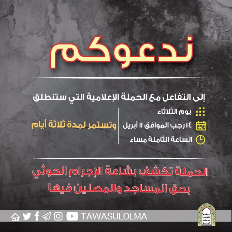 في إطار #الحملة_الإعلامية لبرنامج التواصل مع علماء اليمن، عن #انتهاكات_الحوثيين_للمساجد، أنتم على موعد اليوم الثلاثاء على قناة #رشد، برنامج يا مساء الخير ، الساعة التاسعه والنصف مساء.