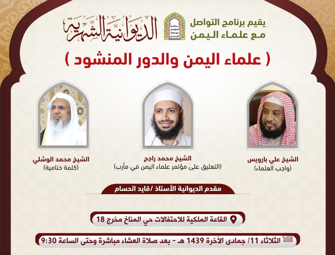 تواصلاً لأنشطته المتعددة يقيم برنامج التواصل مع علماء اليمن الثلاثاء 11 جمادى الآخرة ديوانيته الشهرية في الرياض يناقش فيه علماء اليمن الدور المنشود لعلماء ودعاة اليمن في الظرف الراهن، وستقدم في الديوانية ورقتان الأولى بعنوان : واجب العلماء، يقدمها فضيلة الشيخ علي بارويس مفتي الديار العدنية، وعضو برنامج التواصل مع علماء اليمن، والثانية بعنوان: التعليق على مؤتمر علماء اليمن المنعقد في مأرب في 22/5/1439هـ الموافق 8/2/2018م، ويقدمها فضيلة الشيخ محمد بن راجح عضو برنامج التواصل مع علماء اليمن، تتخلل الديوانية تعقيبات ومداخلات من العلماء والدعاة الحاضرين، وسيقدم فضيلة الشيخ الدكتور محمد الوشلي مستشار برنامج التواصل مع علماء اليمن كلمة البرنامج في ختام الديوانية؛ تعبر عن وزارة الشؤون الإسلامية والدعوية والإرشاد في المملكة العربية السعودية.